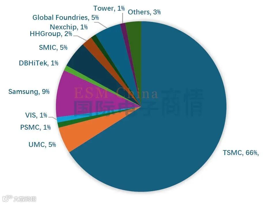 台积电(TSMC)市占率约66%,三星(Samsung)约9%,联电(UMC)、中芯国际(SMIC)、格罗方德(GlobalFoundries)各占5%左右。