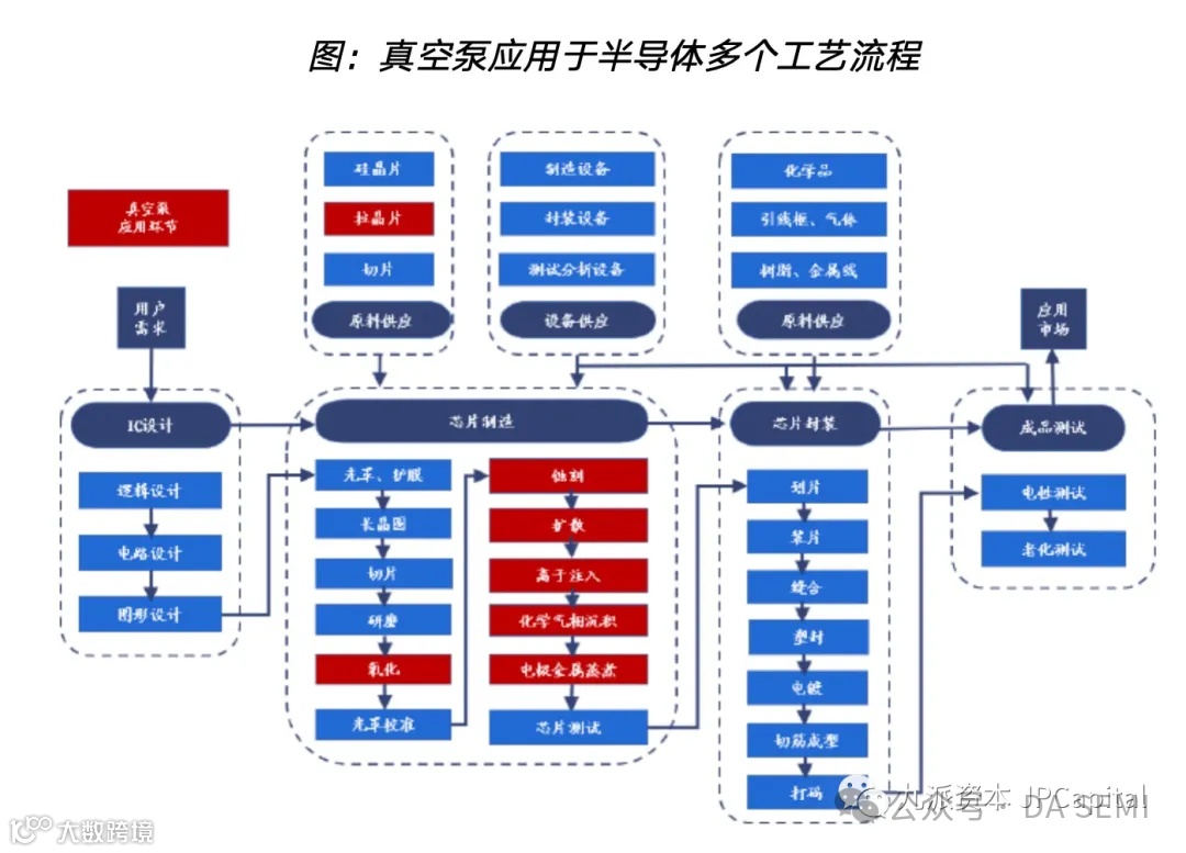 真空泵贯穿半导体生产全流程,涵盖单晶炉、光刻机、刻蚀机、薄膜沉积设备、离子注入机及封装模塑设备等关键环节。