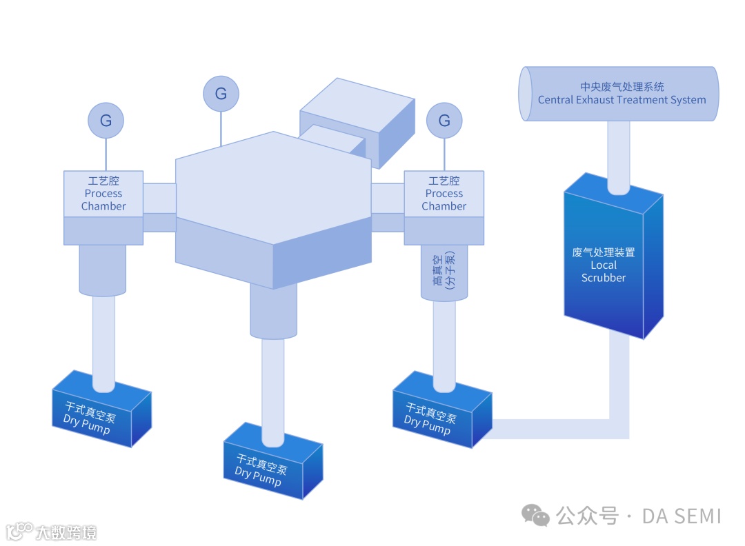 关键组合:真空设备需与废气处理装置(Local Scrubber)配套使用。干式真空泵制造负压将反应气体经管路泵送至尾气处理系统,净化达标后方可排放。