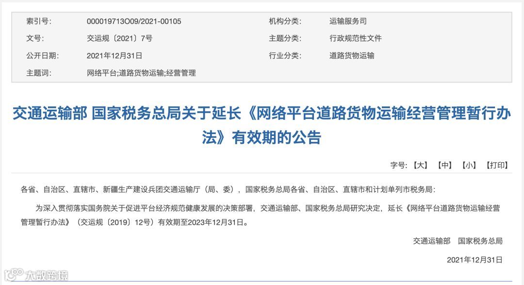 今年 1月份,交通运输部、国家税务总局发布关于延长《网络平台道路货物运输经营管理暂行办法》(简称《暂行办法》)有效期的公告,决定延长《暂行办法》有效期至2023年12月31日。在政策交替的时间节点,这种不变的背后是什么?网络货运接下来怎么走?