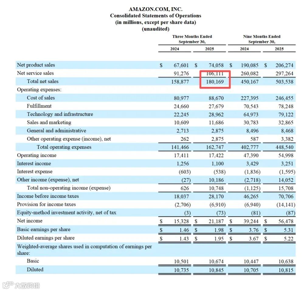 从财报看,亚马逊仍保持强劲增长。2025年第三季度营收达1801.69亿美元,同比增长13.4%;净利润211.9亿美元,同比增长38.22%;云服务收入330亿美元,同比增长20%。
