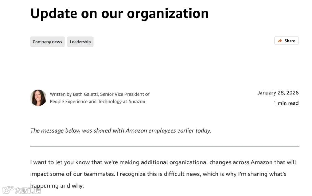 亚马逊人力与技术体验高级副总裁贝丝·加莱蒂在内部博客中表示,此次调整旨在“减少管理层级、提升责任归属、削减官僚流程”。