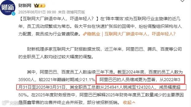 尽管外界有关于阿里“滚动式裁员”的传闻,数据显示其全职员工从2024年初的约20.5万降至2025年3月的12.4万,一年减少逾8万人。