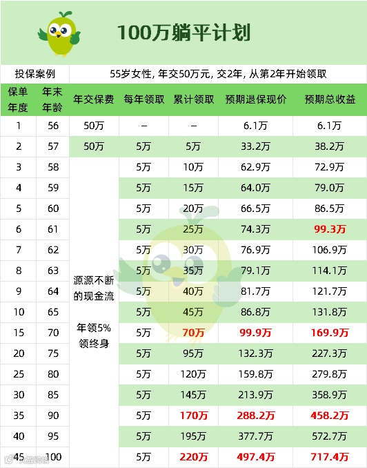 以一位55岁女性为例,年缴50万元,连续缴纳2年,总保费100万元。从第二年起,每年可领取5万元,相当于每月4166元,为退休生活提供稳定补充。