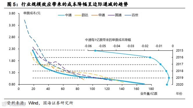 除政策高压监管外,价格竞争策略本身的效率也在逐渐下降。以中通为例,在日票量800万票的2015年,每1亿票的业务量增长可以带来约0.05元的单票成本下降,而到达日均4500万票的2020年,每1亿票的增幅仅能带来约0.004元的单票成本降幅。仅靠业务规模的增长带来成本的自然下降逐渐减少,装载率逼近理论上限、双边线路达到合理数值;行业规模效应呈边际递减的趋势,精细化管理将成为决定成本优化第二曲线的核心因素。