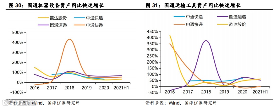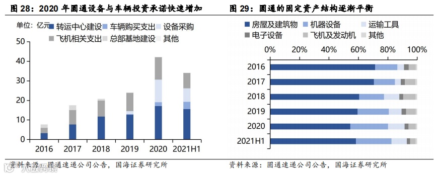 2019年来,圆通调整资本开支结构,自动化设备与运输车辆的投资占比迅速上升,2021H1,自动化设备与运输车辆的投资承诺分别占总资本性支出承诺的20.07%与11.00%。作为通缩型资产的自动化设备与运输车辆具有后发优势,丰富的土地资源叠加快速补充的自动化设备与运输车辆,圆通降本增效成效凸显,竞争实力快速提升。