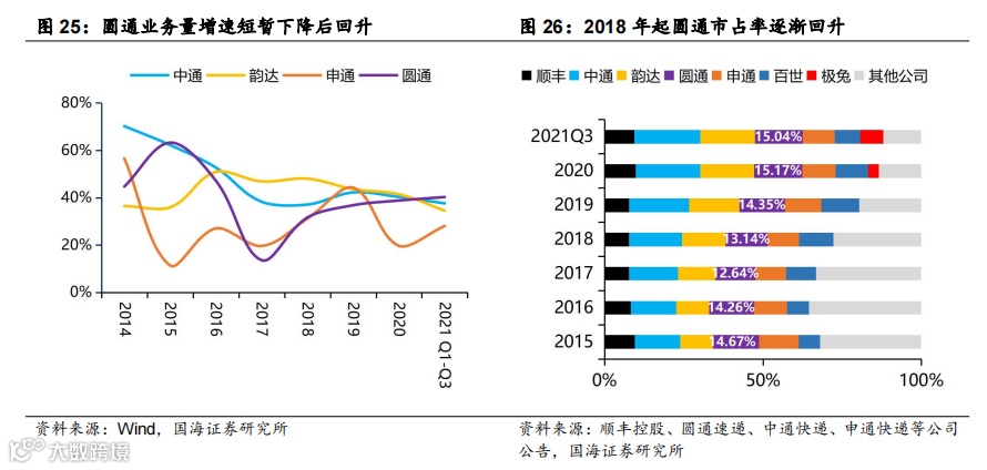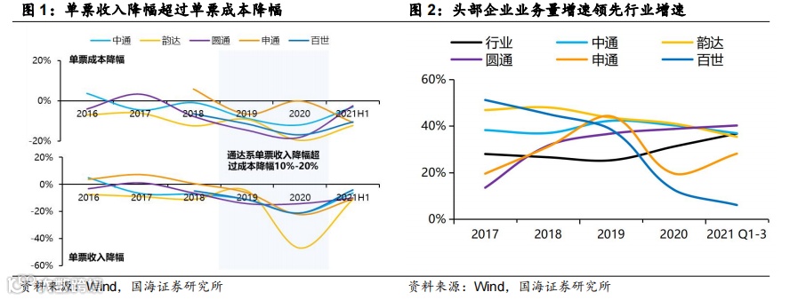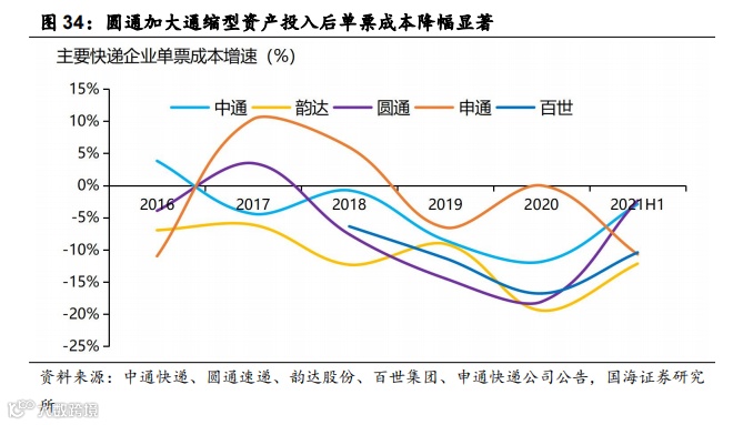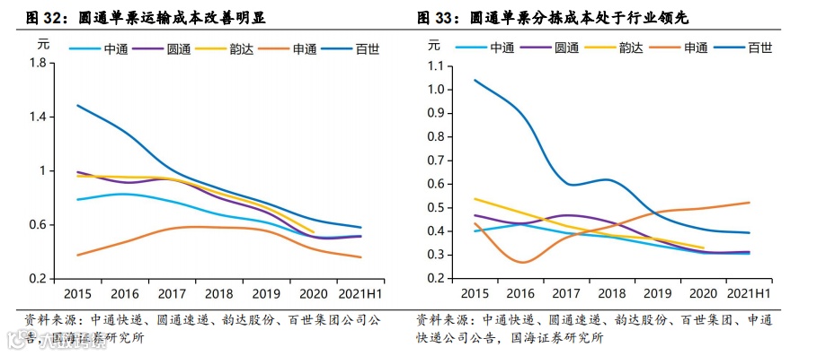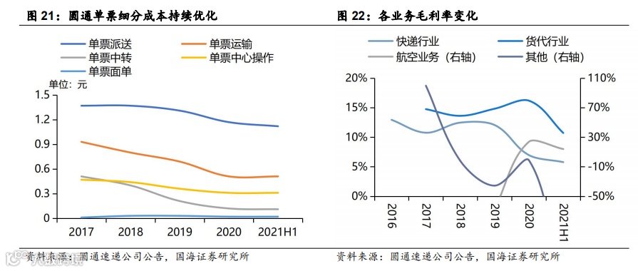 圆通不断补齐自动化设备与运输车队资源,叠加高直营率的转运中心资源(2021H1,圆通共有自营转运中心75个,直营化率已超过90%),圆通成本端快速优化,单票成本降幅领先行业。