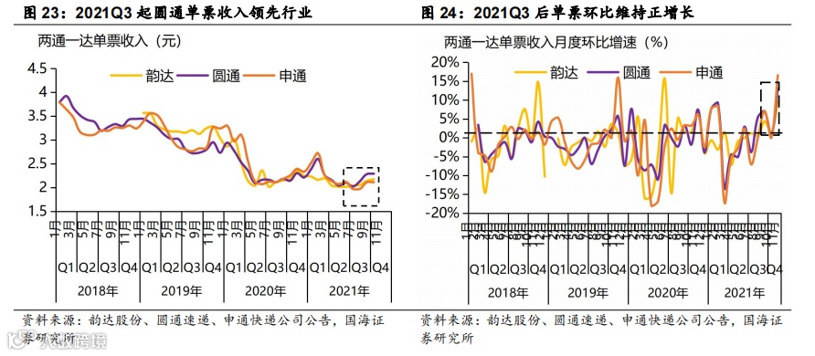 随着快递监管规定的逐步推行,快递行业切换至新的竞争格局中,2021年9月、10月与11月,快递行业三轮涨价逐步落地,各快递企业单票收入向好,而在变化之下,圆通的单票收入修复速度领先行业,自2021年7月以来,圆通单票收入均保持同比、环比正增长,相比2021年7月的低点,圆通2021年11月单票收入已累计增长28.22%至2.59元,涨幅领先全行业。