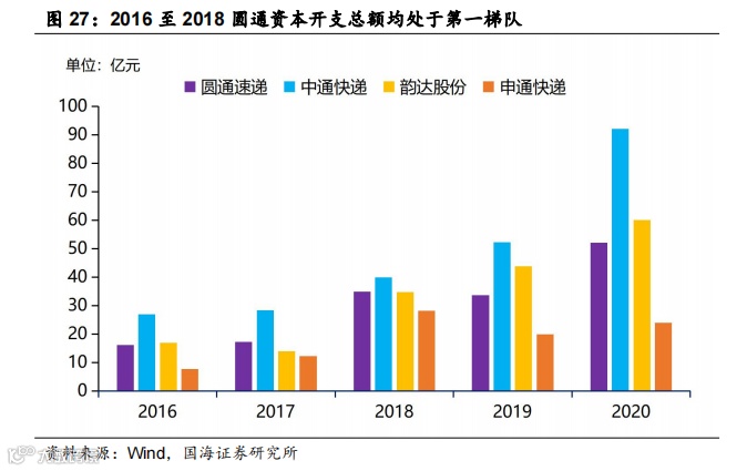 2016至2018年,从总量上看,圆通资本开支水平位于行业前列,三年间圆通资本开支达到68.11亿元,横向对比,中通与韵达资本开支分别达到94.97亿元与65.51亿元。结构来看,圆通在转运中心建设与飞机上的投入较大,而转运中心的资源储备以及全货机为长期布局,短期内对经营层面的改善并不明显。