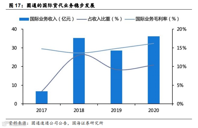 2017年,圆通收购香港先达国际,布局国际货代业务,在国际化的道路上又迈出坚实一步。2017年至今,每年国际货代业务营收约占总营收的10%,毛利率中枢保持在15%左右,保持稳健的发展。