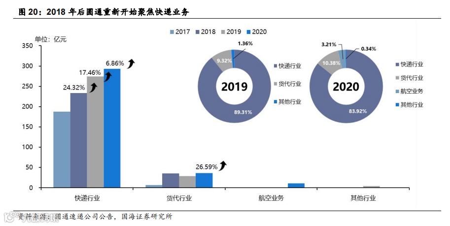 成本结构来看,圆通快递业务成本主要由派送成本、运输成本、网点中转成本与中心操作成本构成,2019年聚焦主业以来,圆通在投资结构上及时调整、在管理上持续推进精细化与信息化,成本端持续优化,对比2017年,2020年圆通单票运输成本与单票中转成本分别下降45.16%与76.47%。