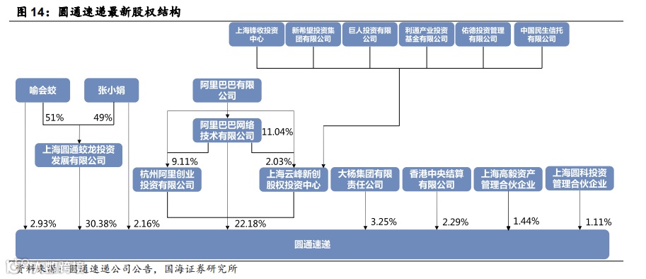 接入电商后十年以来的快速发展,让圆通也与下游电商形成了深度绑定关系。2015年,阿里创投和云峰新创正式入股圆通,总投资金额为25亿元,在当时共持有20%的股权。2016年10月,圆通借壳大杨创世成功登陆A股市场,借壳上市后喻会蛟、张小娟夫妇的蛟龙集团持股51.18%,为实际控制人;阿里系持有17.5%股份,为圆通第二大股东。