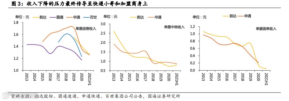 从2019Q4至2021Q2,快递行业恶性价格战已持续近两年时间,企业利润根基受损,融资难度不断增大。脱离成本降幅的价格竞争使通胀压力逐渐从加盟商以及上市公司本身转移至快递小哥身上,2020与2021H1,韵达与申通单票派费收入的同比降幅分别达到9.74%与11.89%,分别占总单票收入降幅的40.10%与48.25%。