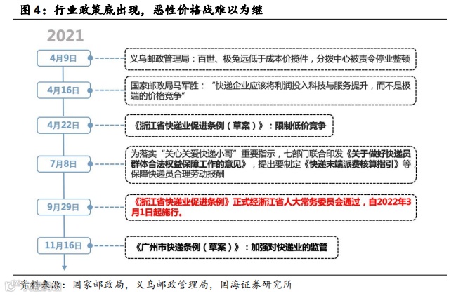 《浙江省快递业促进条例》与《关于做好快递员群体合法权益保障工作的意见》的相继推出,代表政策分别针对快递行业的收入端与成本端进行管控,2021年9月份各头部企业末端派费涨价均已落地;2021年9月29日,《浙江省快递业促进条例》也已正式经浙江省人大常务委员会通过,自2022年3月1日起施行,低于成本价的倾销行为将正式受到法律监管;2021年11月16日,《广州市快递条例(草案)》开启审议,广东与浙江产生的快递业务量约占全国48.21%(2021年1-11月),“草案”在广州市的推出,代表政策监管逐步在全国范围内铺开。行业政策底率先出现。
