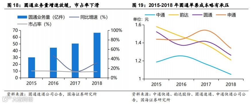 历经十五年的发展,圆通于2015年登上行业第一的位置,快递业务量达到30.32亿票,同比增长63.27%,业务量以及增速均为行业第一。虽然2016年至2017年,圆通业务量同比增速与市占率有过短暂的下滑,但2018年起,聚焦主业发展的圆通业务量增速开始回升。