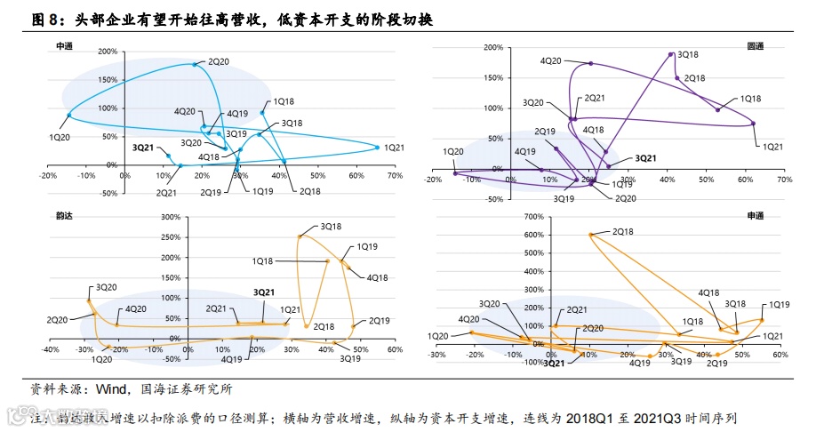 2021Q3,电商快递行业开始往高营收增速、低资本开支增速的发展阶段切换,中通、圆通、韵达与申通营收增速分别为11%、25%、22%与8%,而资本开支增速分别为17%、5%、40%、-55%。头部企业资本开支高峰逐渐过去,行业整体进入优化管理水平、提升盈利能力和修复现金流的阶段。