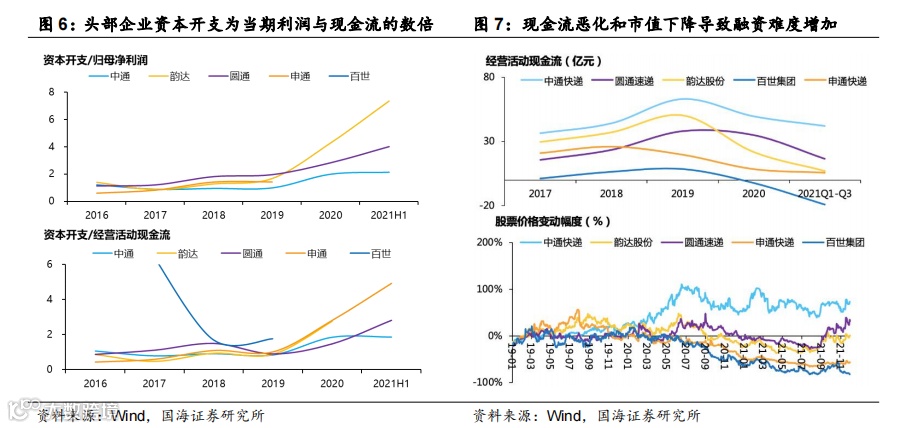 2019年以来,伴随着行业恶性价格战的是各头部快递企业扩张性的资本开支规划。具体来看,2021H1,头部快递企业的资本开支平均已达到其利润的6-7倍、经营活动现金流的2-3倍,在价格战影响下,各企业盈利能力受损,因此头部企业均选择通过外部融资的方式维持高额的资本开支,但在现金流压力增大的情况下,债务融资需要考虑偿债周期与金额的问题;而股权融资方面,价格战导致头部快递企业被戴维斯双杀接近两年,股权融资面临着稀释份额增多的问题。
