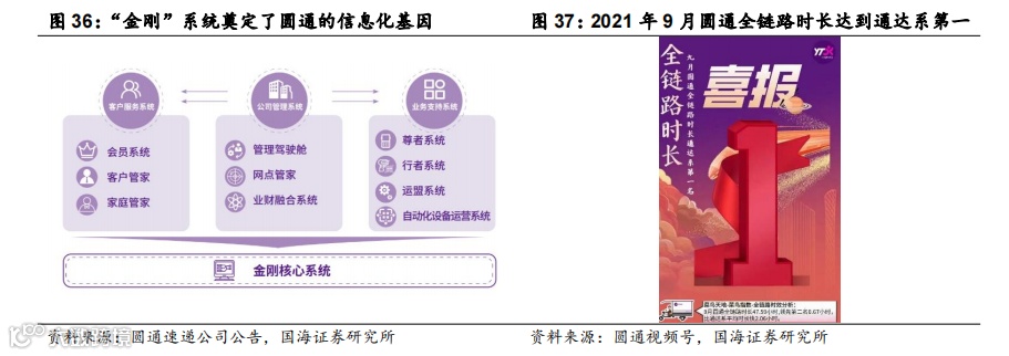 2019年,圆通引入职业经理人制度,原云峰基金董事总经理潘水苗加入圆通担任总裁。潘水苗总就任后,大力推动圆通信息化进程,倡导圆通由原先的“业务驱动”转型为“技术驱动”,细化管理的颗粒度,由信息化技术推动圆通降本增效。圆通在2011年就上线了自主研发的“金刚”核心系统,实现了快递的全流程监控,多年的系统运营经验奠定了圆通的信息化基因,使圆通可以顺利的在总部以及加盟商处,推行统一的信息化平台以及标准化的管理体系。