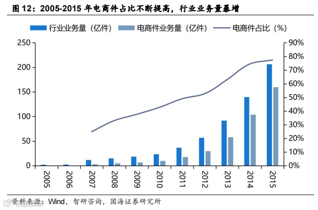 2005-2015年,快递行业业务量实现爆发式增长,年均复合增长率达到56.87%,其中电商件占比也于2012年首次超过50%,正式成长为中国快递市场的主流赛道。