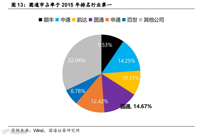 作为电商快递领域的先行者,圆通先通过低价快速扩张业务规模,再通过信息化系统的前瞻布局,对快递服务全流程进行可视化监控,服务质量与转运效率得以提升。在电商快递领域的不断“求变”,使得圆通在电商快递行业建起了竞争壁垒,2015年业务量市占率达到14.67%,成为行业第一。