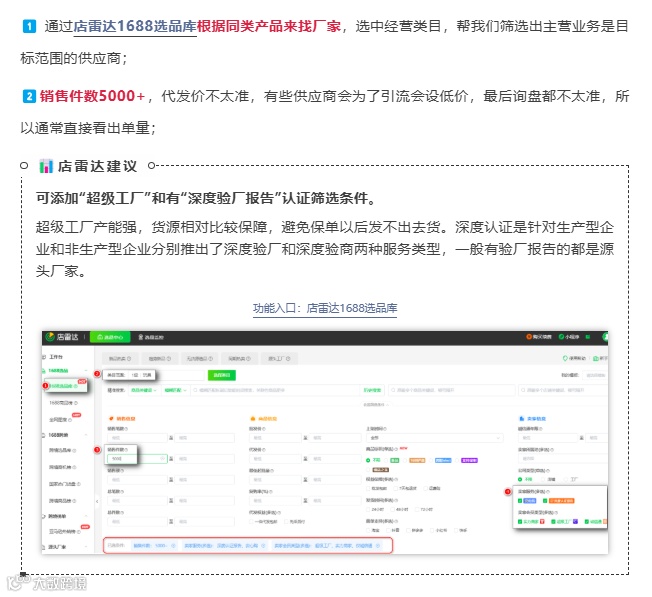 2、转型精铺或精品模式:这个模式的本质在于卖家要在特定垂直品类内,基于深度数据分析,筛选出有限数量的潜力产品,进行精细化运营和迭代,而“精品模式”则更进一步,要求围绕1-3个核心产品打造品牌,追求更高的客户忠诚度和溢价。卖家可以联动店雷达1688选品库、一手源头厂家等功能来打造精品。
