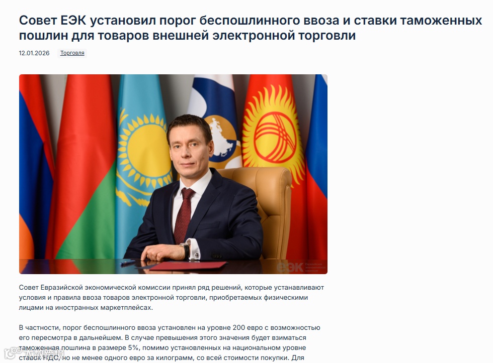 近日,欧亚经济委员会(EEC)的一纸公告,在跨境电商领域激起涟漪:自2026年7月1日起,俄罗斯、白俄罗斯等五个成员国将对价值低于200欧元的个人跨境网购包裹免征进口关税,超过200欧元的商品,则适用5%的关税税率。