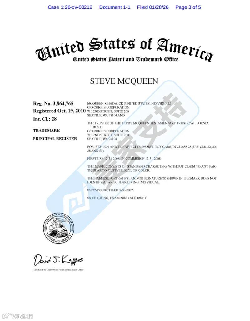 本案是AGDG律所代理Chase Terrence McQueen et al 发起的商标维权案件,案件主要涉及商标号为:3934709、3864765、4142859和3948067 等四个Steve McQueen 商标,分别注册在第9、16、25和28大类,涵盖太阳镜、海报、鞋帽服饰以及玩具车辆等类目,未经授权使用则会面临TRO冻结风险!目前该案件处于前期立案阶段,暂未获批TRO临时限制令,跨境卖家需尽快排查,并下架高危产品,提前做好应对措施!