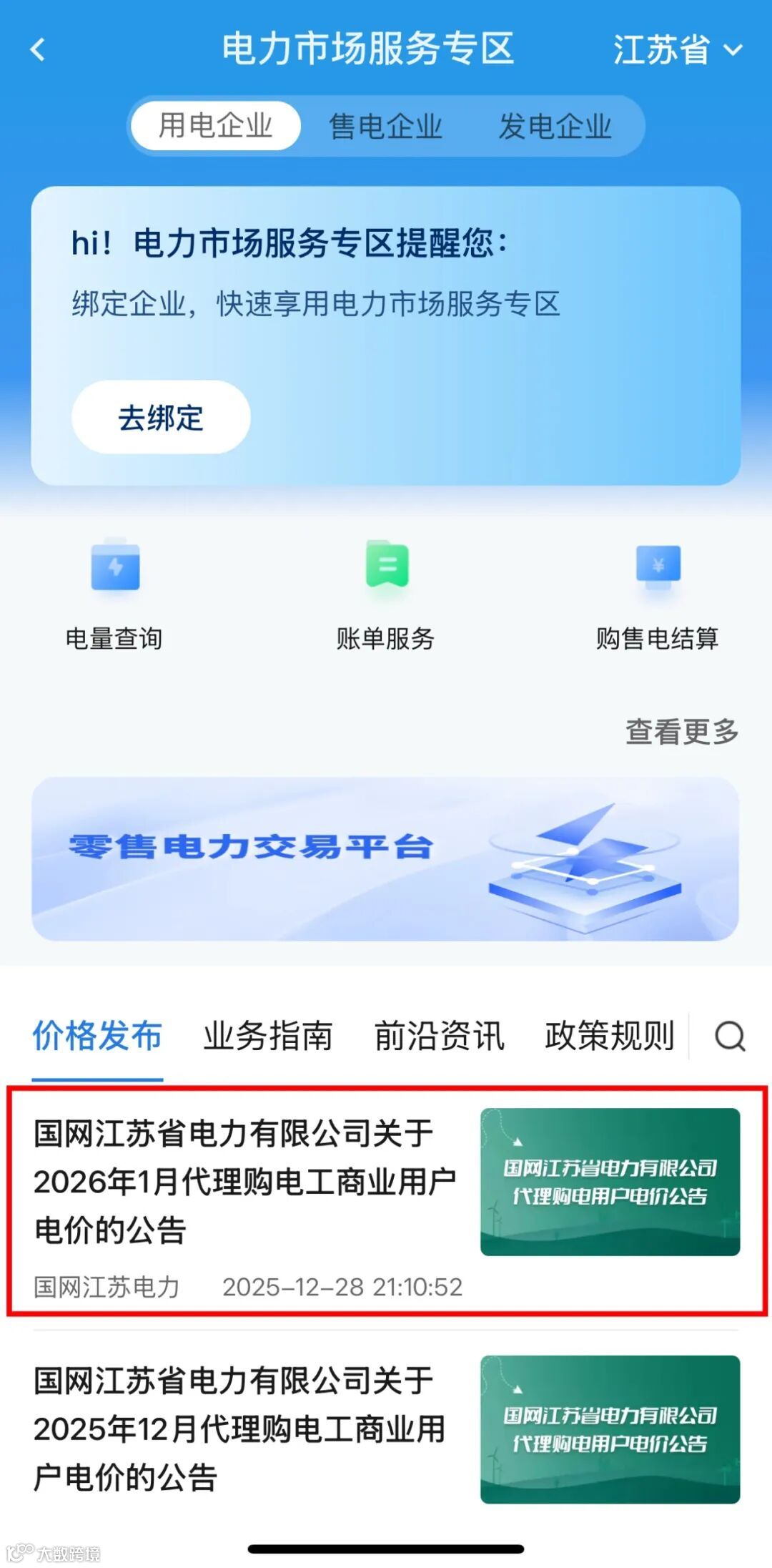 根据《国家发展改革委关于进一步深化燃煤发电上网电价市场化改革的通知》(发改价格〔2021〕1439号)、《国家发展改革委办公厅关于进一步做好电网企业代理购电工作的通知》(发改办价格〔2022〕1047号)、《国家发展改革委关于第三监管周期省级电网输配电价及有关事项的通知》(发改价格〔2023〕526号)、《省发展改革委关于进一步做好深化燃煤发电上网电价市场化改革工作的通知》(苏发改价格发〔2021〕1008号)、《省发展改革委转发<国家发展改革委关于第三监管周期省级电网输配电价及有关事项的通知>的通知》(苏发改价格发〔2023〕552号)、《关于优化工商业分时电价结构促进新能源消纳降低企业用电成本支持经济社会发展的通知》 ( 苏发改价格发〔2025 〕426号)、《省发展改革委 江苏能源监管办关于开展2026年电力市场交易工作的通知》(苏发改能源发〔2025 〕1141号)有关要求,经报省发展改革委备案,国网江苏省电力有限公司代理购电工商业用户电价表已公示,详情可通过网上国网App、国网江苏省电力有限公司当地营业厅等线上线下渠道查询。