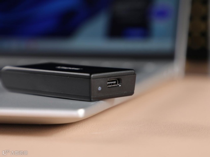 硬盘配备Type-C接口,侧面设有蓝色工作指示灯,连接时会闪烁提示数据传输状态。