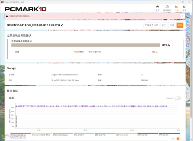 PCMark 10完整系统盘测试得分为833,平均带宽131.20MB/s,平均存取时间198μs,整体性能符合预期,日常使用流畅无压力。