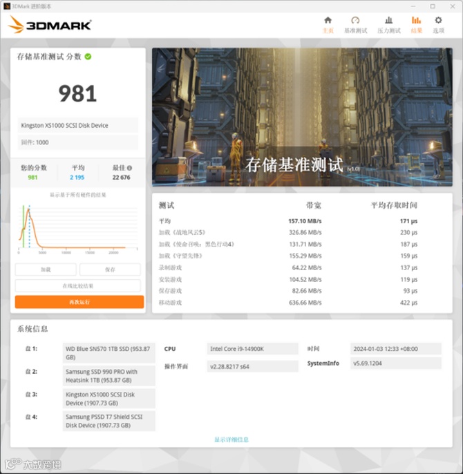 3DMark存储专项测试得分981,平均带宽157.10MB/s,平均存取时间171μs,足以应对主流游戏存储需求,适合作为外接游戏库使用。