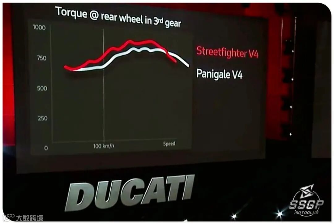与 Panigale V4S 相同,它的定风翼也是一大特色。Streetfighter 的动力输出部分是 208ps 马力,峰顶的转速比 Panigale V4S 提前了 250 转,所以虽然最大马力比较小,但最大马力的出现也是较为提前的。