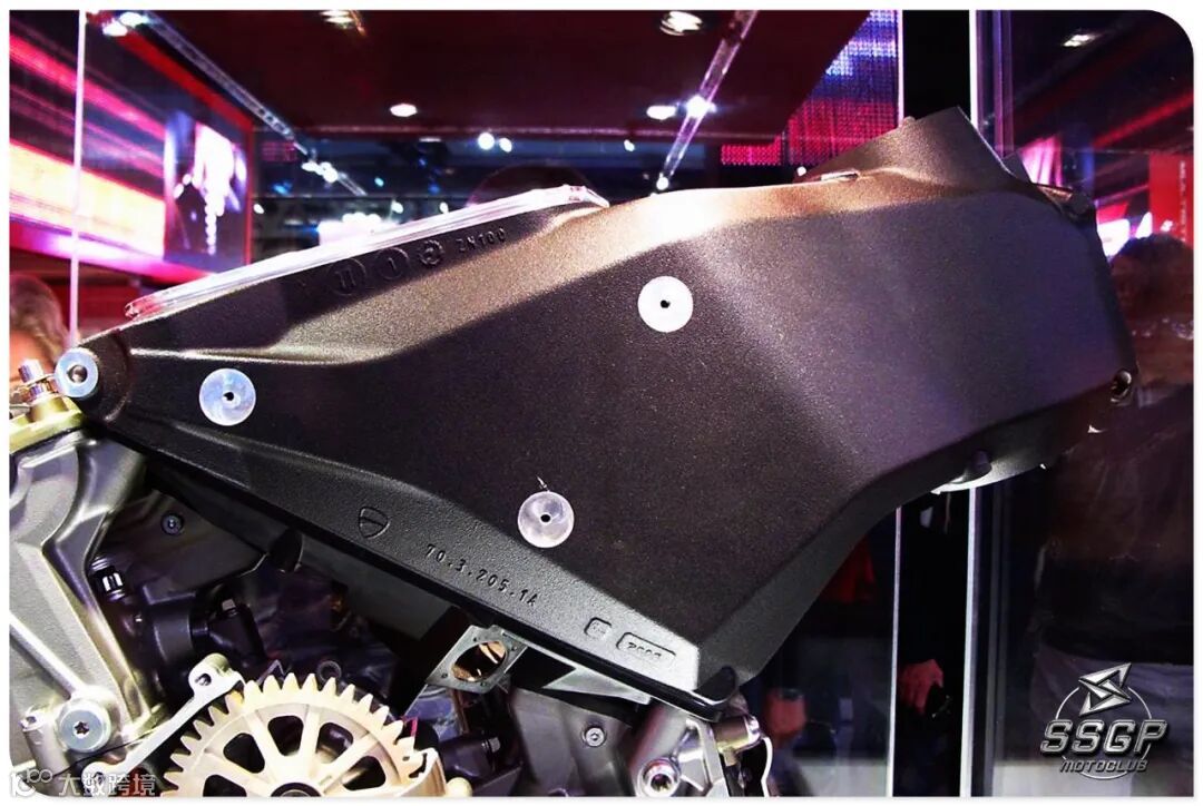 在新年式的外观上,增加了车头的小翅膀,这定风翼可说是一大重点。而且敲敲看,它不像一般副厂改装的塑料部件,它其实非常稳固的塑钢材质。除了原本的 V4S,还有后续衍生出来的 Streetfighter 车款,都有前面的定风翼。整体来说,V4S 跟 Streetfighter 这两款车说是最强的道路仿赛车款,与最强的街车车款,真的是当之无愧。