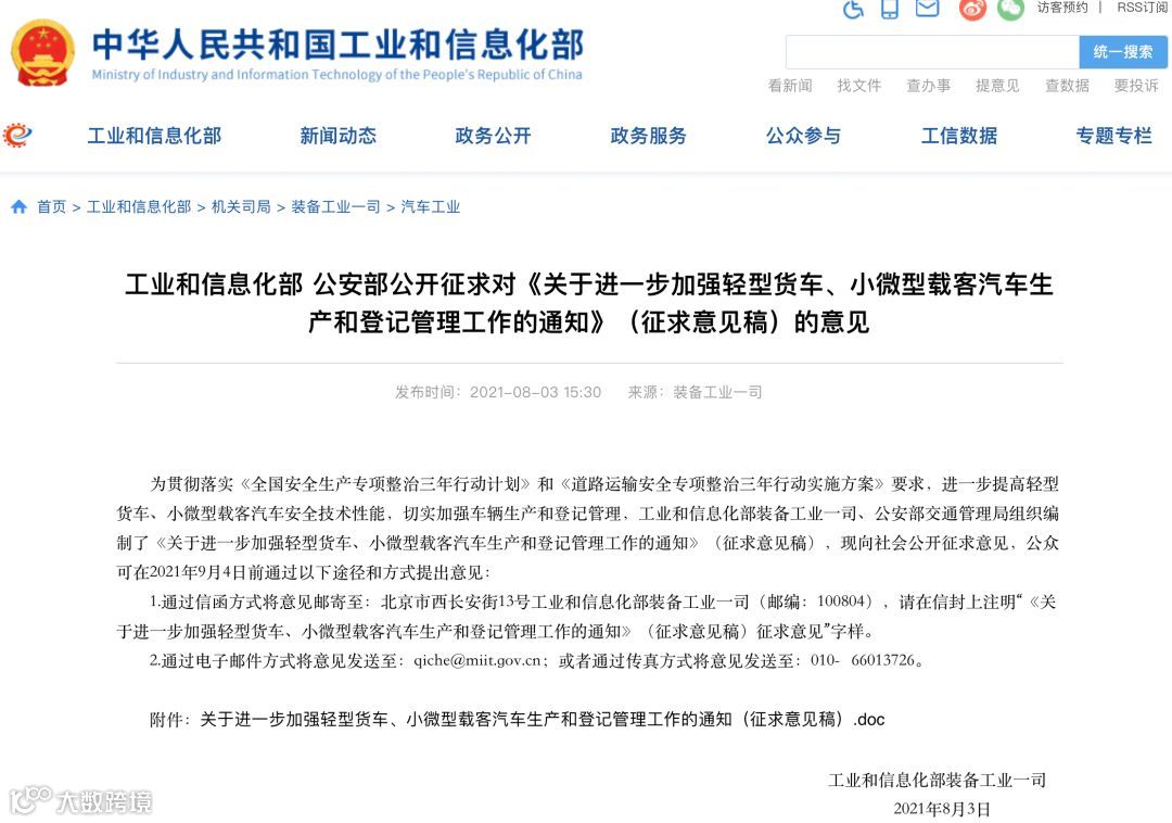 8月初,工业和信息化部、公安部发布《关于进一步加强轻型货车、小微型载客汽车生产和登记管理工作的通知》(征求意见稿)。