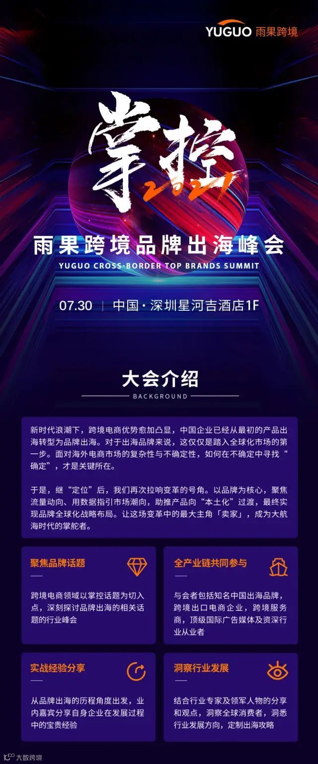 2021年7月30日,由雨果跨境主办的“掌控·2021雨果跨境品牌出海峰会”将在深圳星河吉酒店举行。