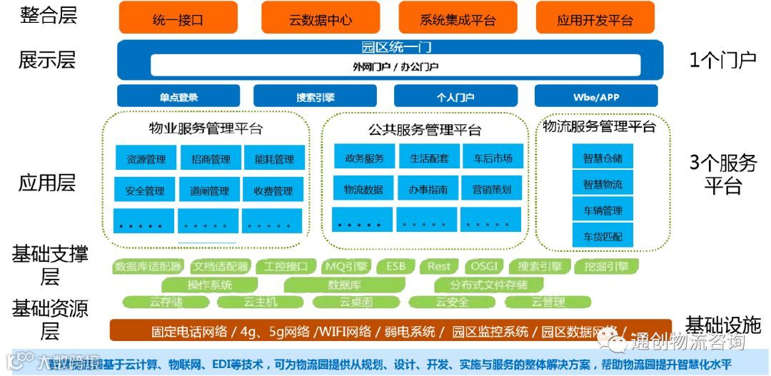 智慧物流园区整体架构由基础资源层、基础支撑层、应用层、展示层、整合层构成,体现为“一个门户、三大服务平台”体系,如图1所示。