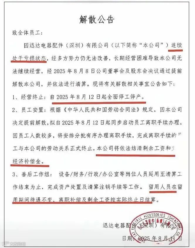 8月30日,奥创电器发布解散公告,称因“严重资不抵债、无法正常开工”,即日起终止运营并解除全体员工劳动合同。该公司为拥有十余年历史的外贸企业,高峰期员工人数超过1200人。