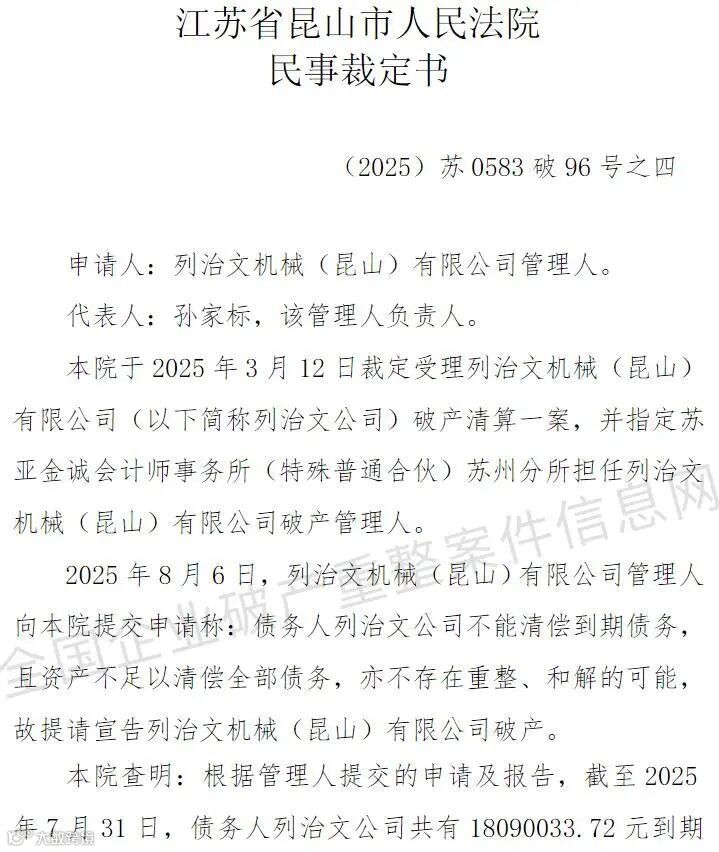 9月1日,全国企业破产重整案件信息网发布列治文机械(昆山)有限公司破产公告,标志着这家运营15年的设备制造企业正式退出市场。