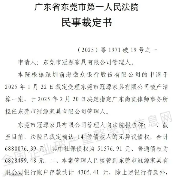东莞市冠源家具有限公司近日被东莞市第一人民法院裁定破产,并终结清算程序。经管理人核查,公司破产前银行账户余额仅4305元,负债总额约688万元,已严重资不抵债。