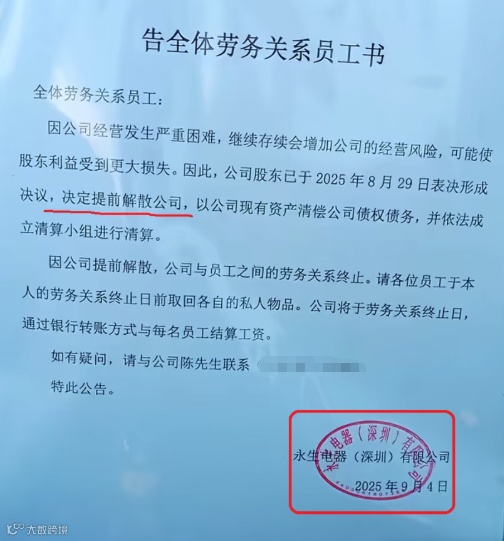 据员工反映,9月3日仍在正常上班,次日即被告知公司解散,生产经营戛然而止。