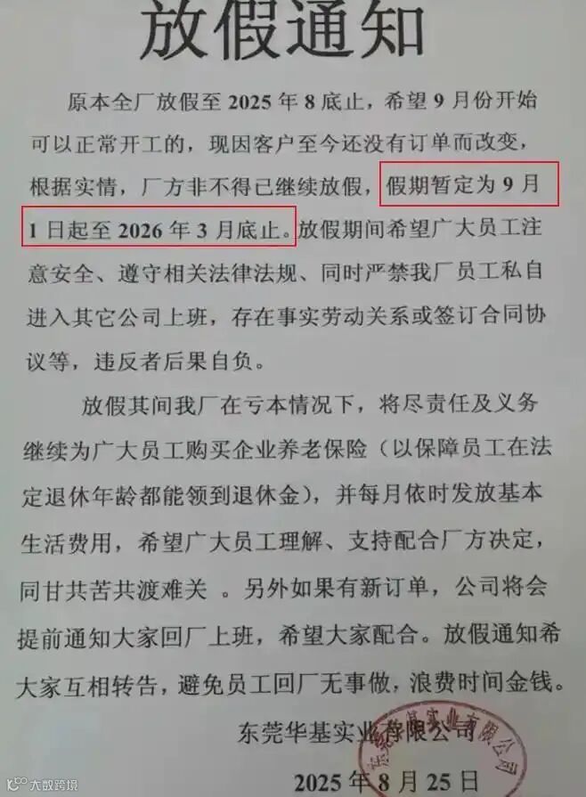 8月25日,东莞华基实业有限公司宣布继续停产放假7个月,时间为2025年9月1日至2026年3月底。此前,该公司已连续多年实行半年停工、半年复产的模式,自2021年起每半年发布一次停产通知。