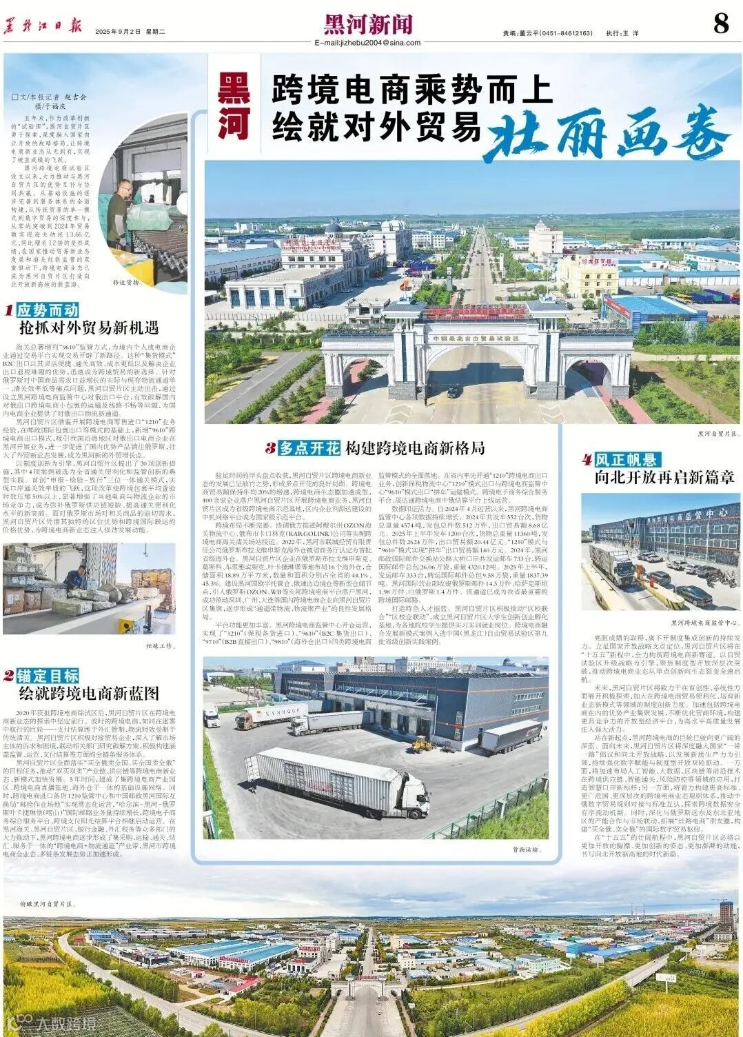 作为核心载体,黑河跨境电商试验区与自贸片区协同发展,基础设施持续完善,服务体系全面构建。2024年实现海关纳统贸易额13.66亿元,同比增长12倍,成为区域外贸增长的核心引擎。