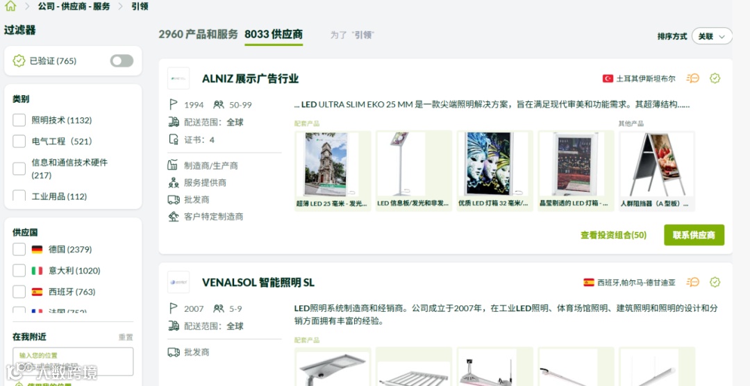 在搜索结果页左侧,可通过“产品目录”和“国家列表”两个维度进一步筛选,提升匹配精度。确定目标后,点击“供应商数量”链接,进入供应商列表页面。