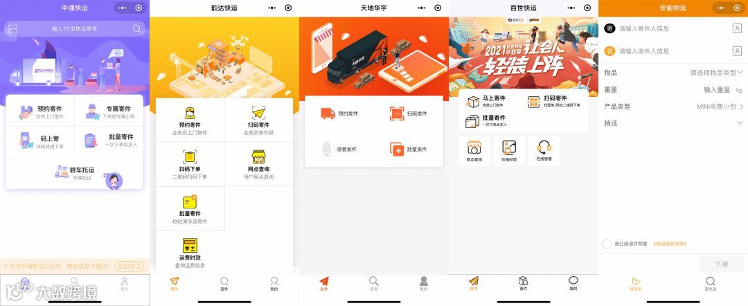 (中通快运、韵达快运、天地华宇、百世快运、安能物流小程序首页对比)