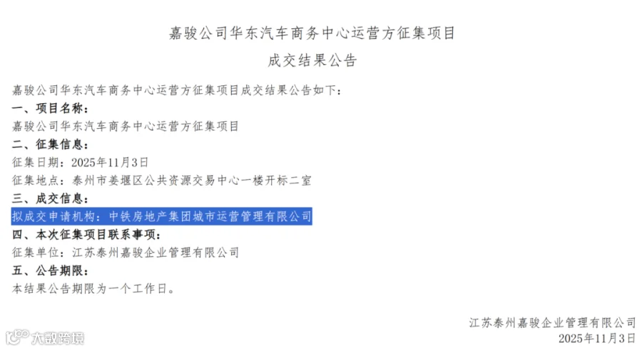 11月3日,该项目完成征集,并发布了评标结果公示,拟成交申请机构为中铁房地产集团城市运营管理有限公司。