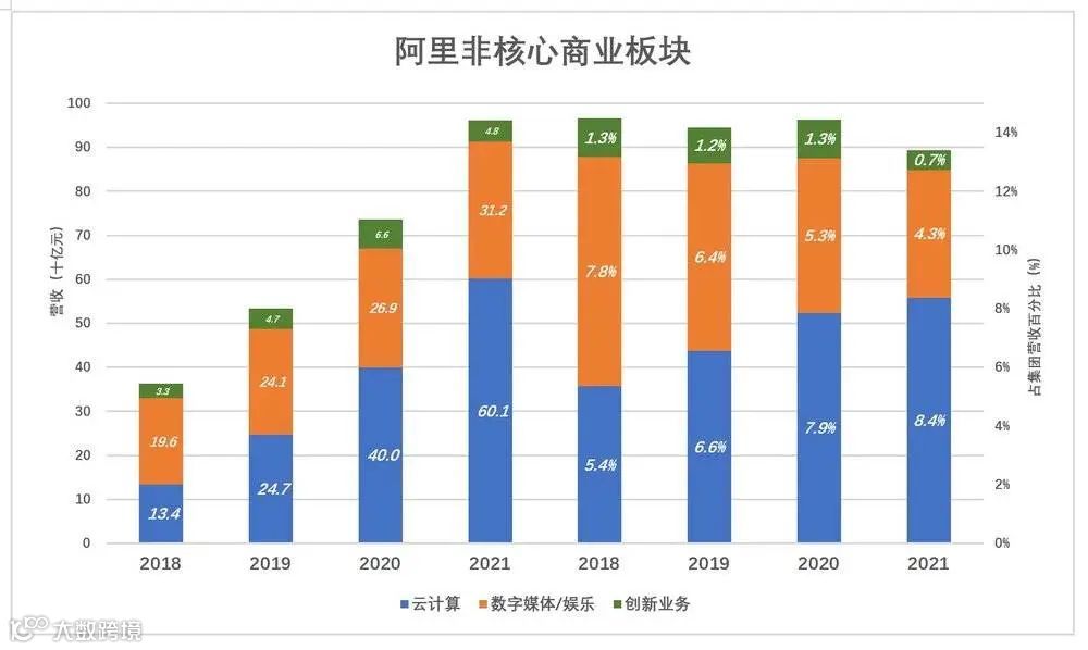 阿里“云计算”是IaaS及基础设施公用事业服务提供商;数字媒体/娱乐分部的主体是优酷、UC浏览器两大内容分发平台;创新及其它分部包括高德地图、钉钉、天猫精灵。三大非核心商业板块,占集团营收的比重始终没有超过15%。