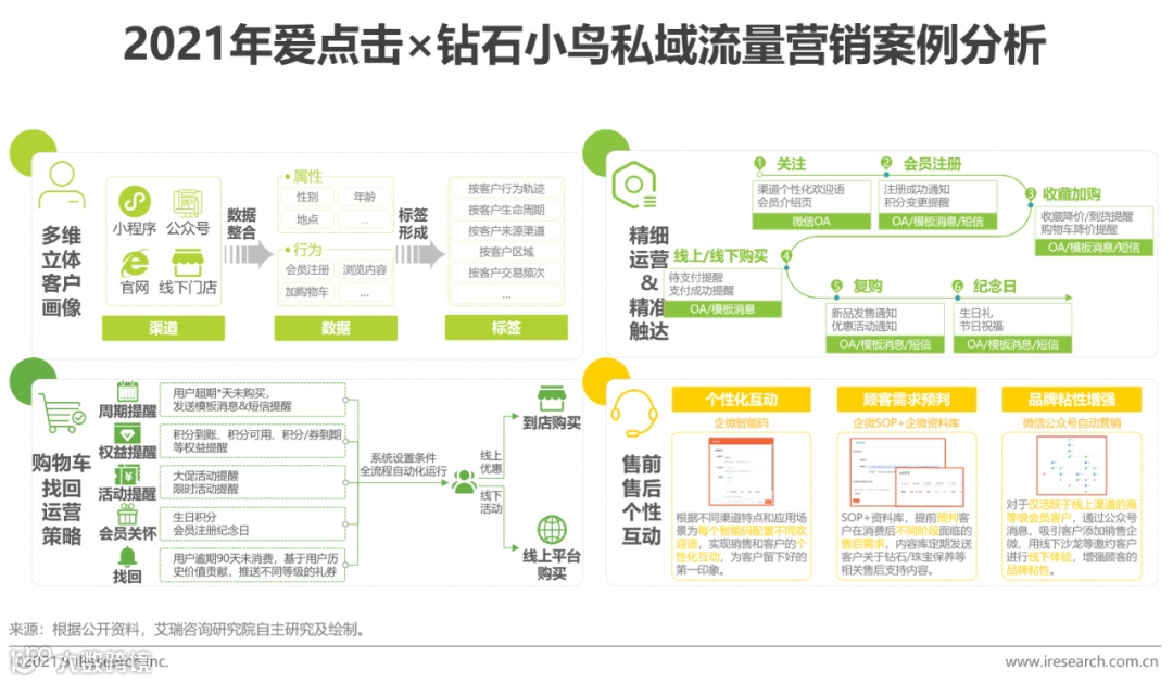 1)企业需求:钻石小鸟在拓展线上业务过程中,亟需通过私域精细化运营实现客户与GMV同步增长。2)执行策略:借助iParllay爱信来平台,构建包含多维用户画像、全生命周期自动触达、购物车找回引擎及服务号与企微联动的智能运营体系。3)执行效果:会员注册率提升62%,内容阅读率增长102%,购物车找回下单率达31%,显著提升客户粘性与销售额。