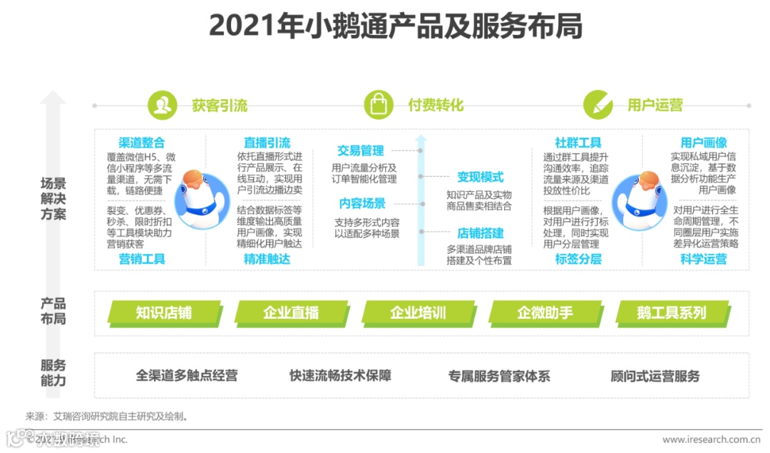 小鹅通专注于知识产品与用户服务,提供知识店铺、直播、企业培训、企微助手等产品,覆盖获客引流、付费转化与用户运营三大场景。通过渠道整合、私域直播与营销工具沉淀用户,协助企业完成店铺搭建至交易闭环,并基于用户画像实现分层运营。