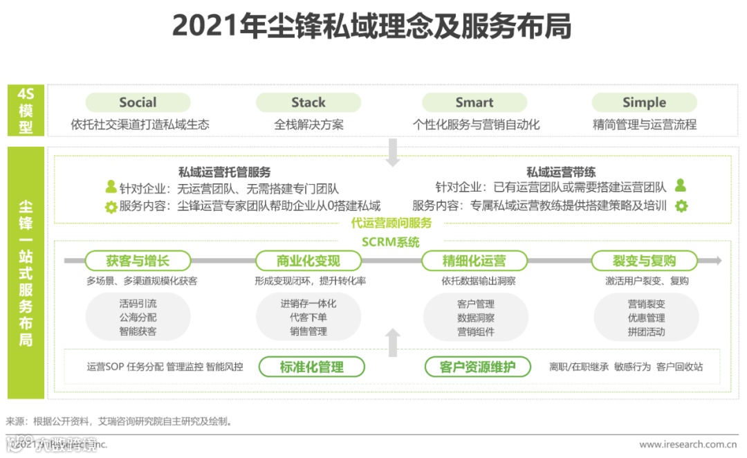尘锋是企业微信官方认证服务商,率先提出“4S”模型——从“社交”向“全栈、智能、简单”升级,打造“SCRM工具+代运营服务”双引擎模式。以数字化营销工具为基础,配备专业顾问团队,助力企业完成私域运营落地与闭环增长。