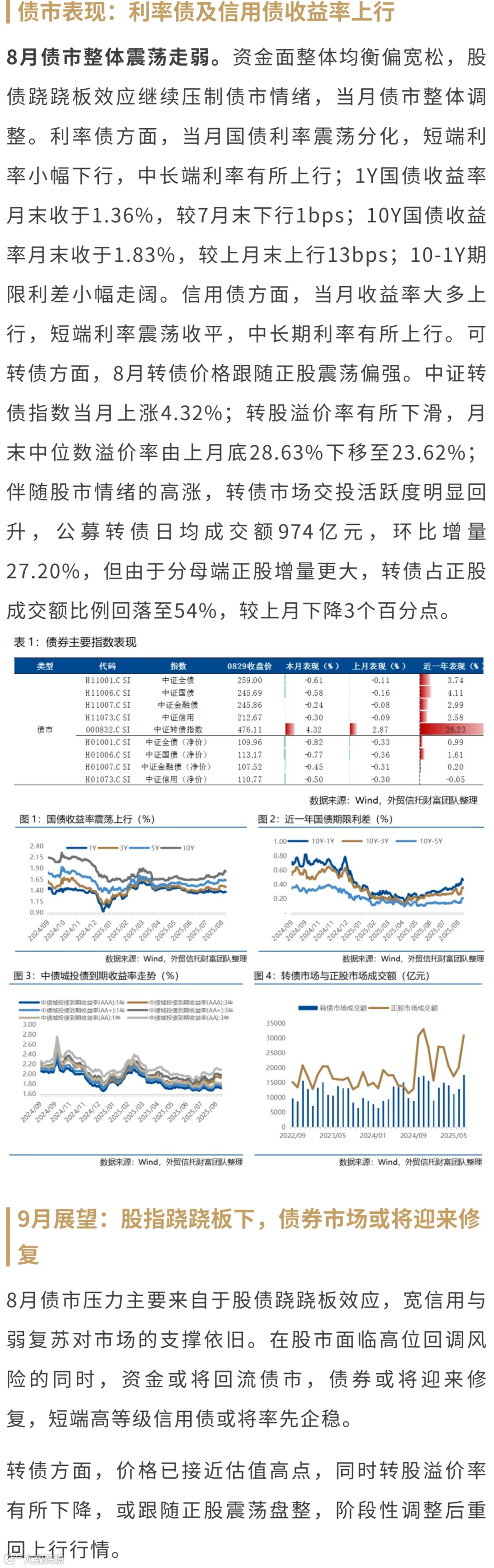8月回顾:债市整体震荡偏弱。资金面维持均衡宽松,但受“股债跷跷板”效应压制,利率债走势分化,短端利率小幅下行,中长端上行;信用债收益率普遍上行,短端企稳,中长期承压。可转债价格跟随正股震荡走强。